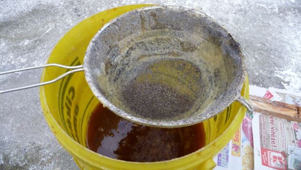 Když je vosk pěkný čistý, z parního tavidla nebo z vařáku, z víček nebo z panenských plástů, stačí jej jenom jednou přetavit v čisté vodě. Po krátkém mírném varu naleju přes cedník do plastového kbelíku, kde nechám vosk vychladnout. V cedníku se zachytí hrubé nečistoty. Poté kbelík s voskem umístím v teple, aby drobné nečistoty měly čas klesnout na spodek koláče, dřív než vosk ztuhne.