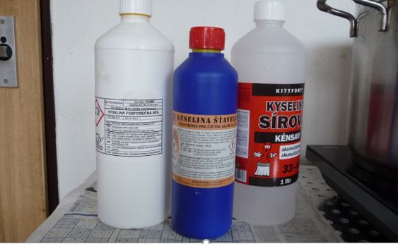 Znečištěný vosk jako je na obr. 1. vlevo a vpravo dál čistím kyselinou šťavelovou. Kyselina fosforečná se používá, jen když je vosk znečištěn oxidy kovů. Na 2 Kg vosku dávám 1 l vody, 10 g kyseliny šťavelové, která odstraňuje hnědá barviva ve vosku a pokud je vosk zbarven oxidy železa, tak 10 ml kyseliny fosforečné. Jestliže nepoužíváte staré rezaté hrnce na tavení vosku, pak by oxidy železa ve vosku být neměly a kyselinu fosforečnou nepoužívám. Směs přivedu k varu a za stálého míchání vařím 5 až 10 minut.