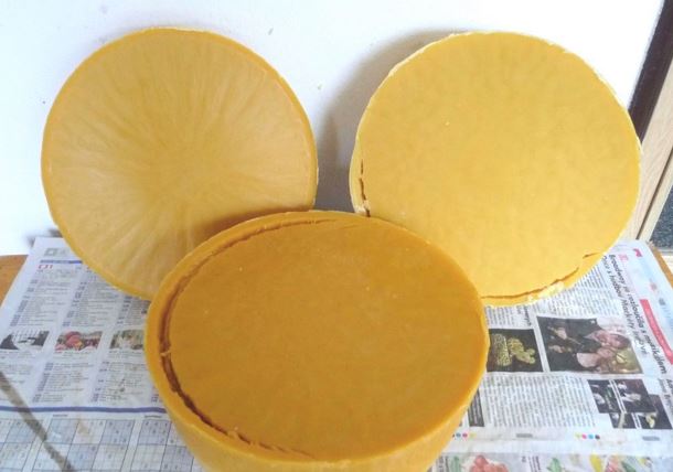 A tady je stejná sestava voskových koláčů jako na obr. 1 po vyčištění. Vlevo vosk ze starých zaplodovaných plástů, vpravo z roztavených zakoupených mezistěn a vpředu kontrolní vlastní vosk z vybraných vyřazených souší jednou přetavených ve vodě..