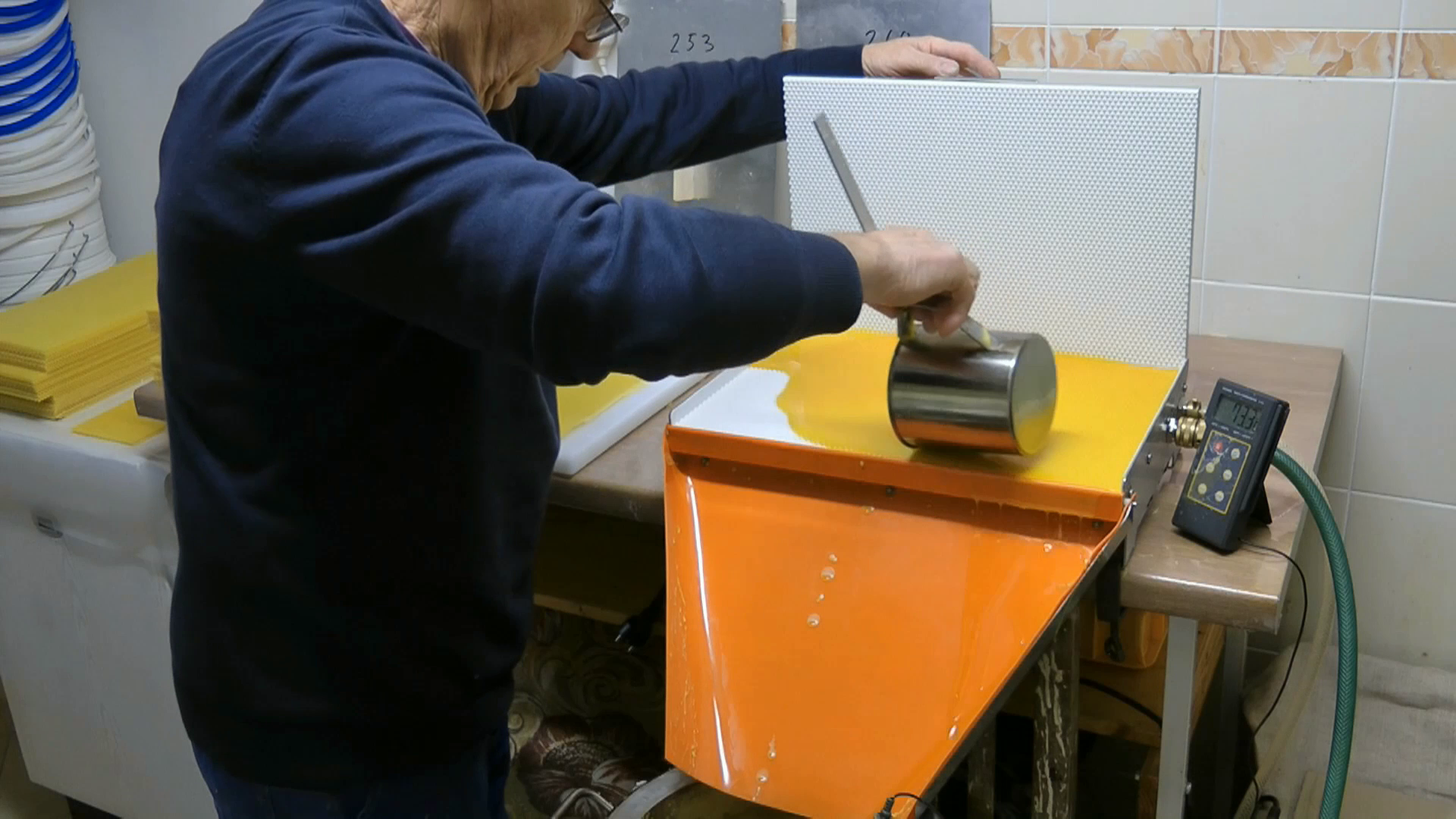 Lis postavíme na pevnou plochu podle vodováhy, v obou směrech. Pokud bude nakloněn, vosk rychle vyteče, nevyplní vrchní matrici a mezistěna bude plochá bez reliéfu buněk. Separátor není třeba, ale je možné používat vodní roztok s 1% jaru a 1% lihu tj. 10ml jaru a 10 ml lihu na 1 l vody. Separátor je třeba nanášet kvalitním Jemným rozprašovačem. Vosk na odlévání musí mít správnou teplotu okolo 85 až 90°C. Bude-li vosk studený, bude mezistěna zbytečně tlustá a bude-li vosk moc teplý, rychleji vyteče a nemusí vyplnit vrchní matrici.